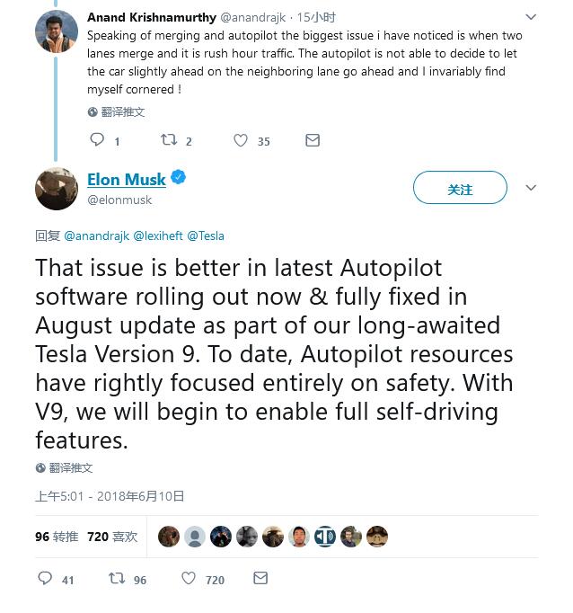 马斯克在推特中还表示,目前Autopilot自动辅助驾驶软件还是集中在安全方面,而在第9版软件中,他们将开启全自动驾驶功能。