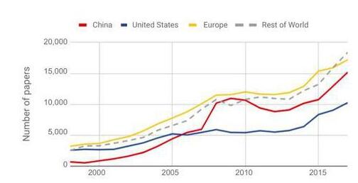 第一:在全球AI论文发表概况地区分类中,欧洲一直是近几年最大的AI论文产出地,数据显示2017年28%的AI论文源自欧洲,但在2007年至2017年间,中国发表的论文数量增长了150%,目前超过美国,仅次于欧洲。