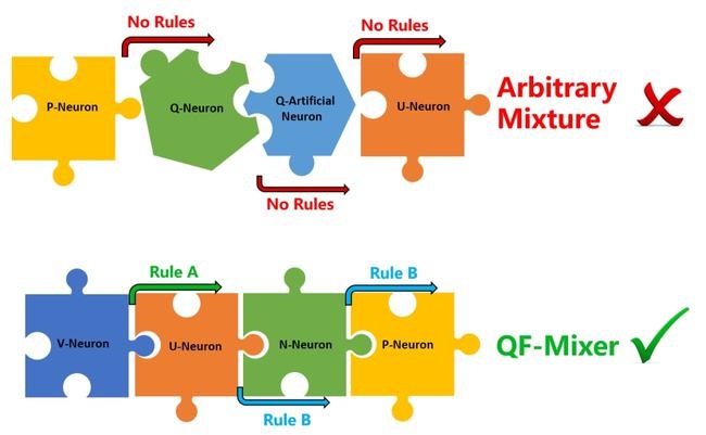 首先,不同的量子神经元对输入和输出的量子态 (quantum state) 有着不同的要求,任意地连接两类神经元往往无法达到这些预设的要求。