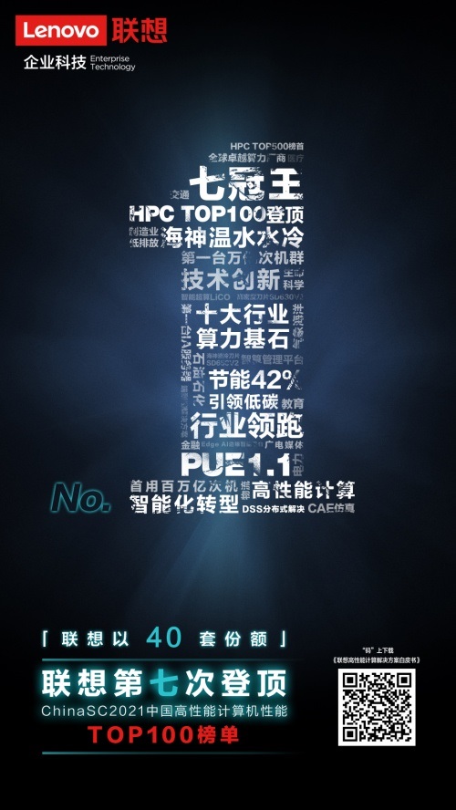 11月12日,在第三届中国超级算力大会ChinaSC暨中国智能计算产业联盟理事会上,联想以40套入围的成绩荣获2021年“HPC TOP100年度数量总份额冠军”,这也是联想第七次在该排行榜中夺魁。