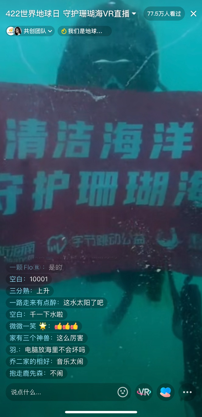 4月22日,我们又迎来了世界地球日。今年的主题为“众生的地球”——众生起源于海洋,海洋与万物生灵的栖居与生活息息相关。因此,关注海洋生态环境,早已成为人类共同的职责。为了提升大众对海洋生态的认知,海南广播电视总台国际传播融媒体中心、字节跳动公益、无境深蓝共同发起守护珊瑚海VR公益直播。直播中,海洋保育公益机构无境深蓝带领潜水员志愿者、旅行推介官@千一共同潜入海南蜈支洲岛,使用全景摄像机,带领观众用VR视角近距离观察珊瑚、海草、海鱼以及其他海洋生物,现场为观众科普讲解珊瑚的种类 、生物的习性、苗圃的用途、生态保护的重要性等等。
